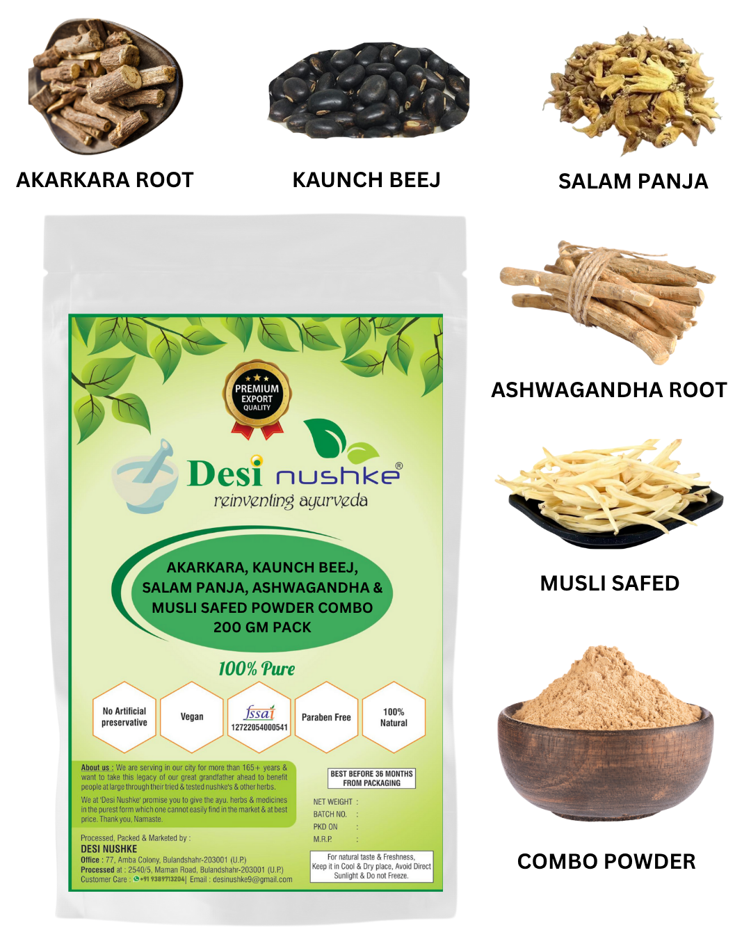 DESI NUSHKE Akarkara Root, Kaunch Beej, Salam Panja, Ashwagandha & Musli Safed Powder Combo | 200 GM | Boosts Power, Stamina, Strength, Vitality for Men | 7.05 Oz