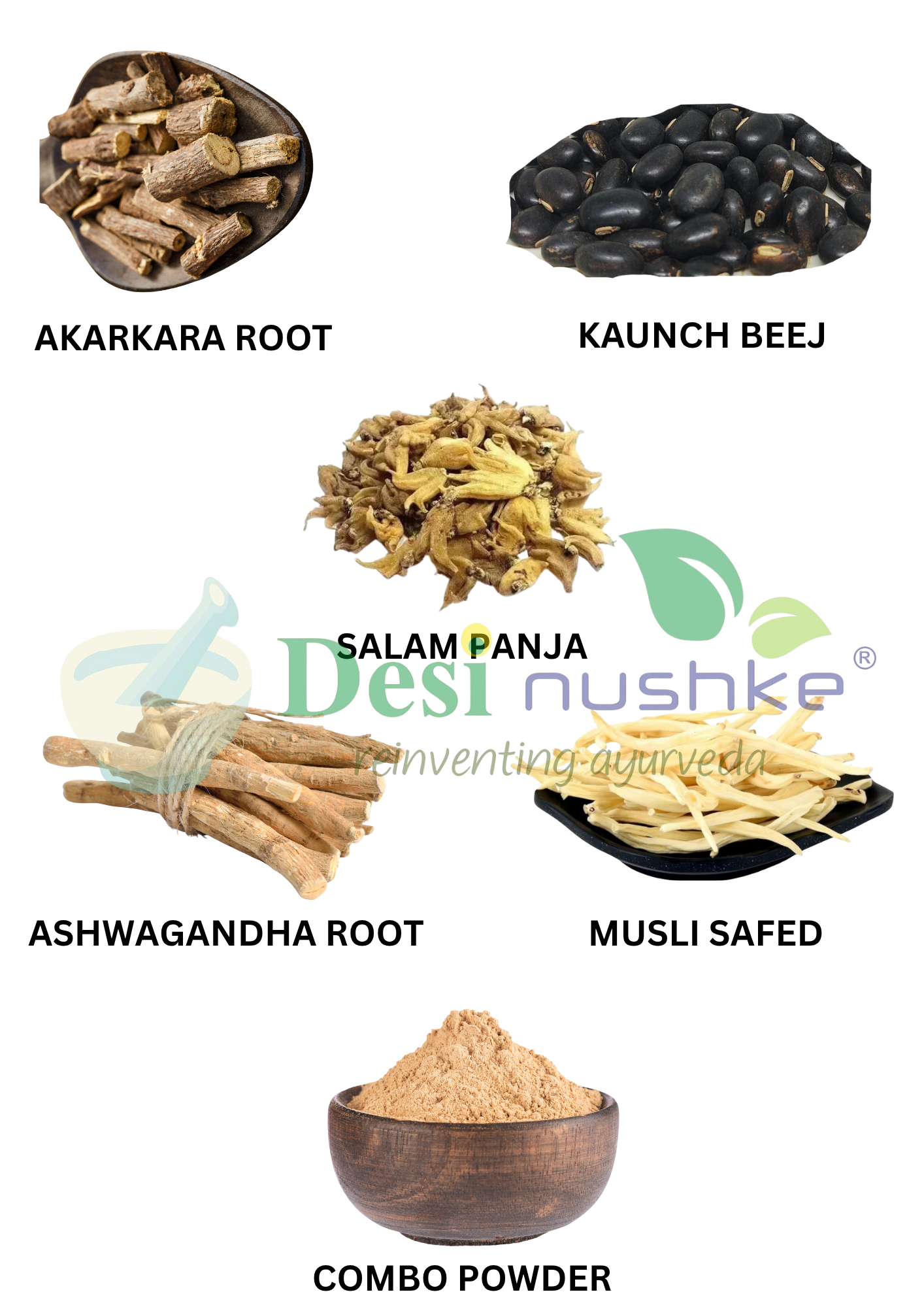 - Pack Contains Akarkara Root, Kaunch Beej, Salam Panja, Ashwagandha & Musli Safed in powdered form.