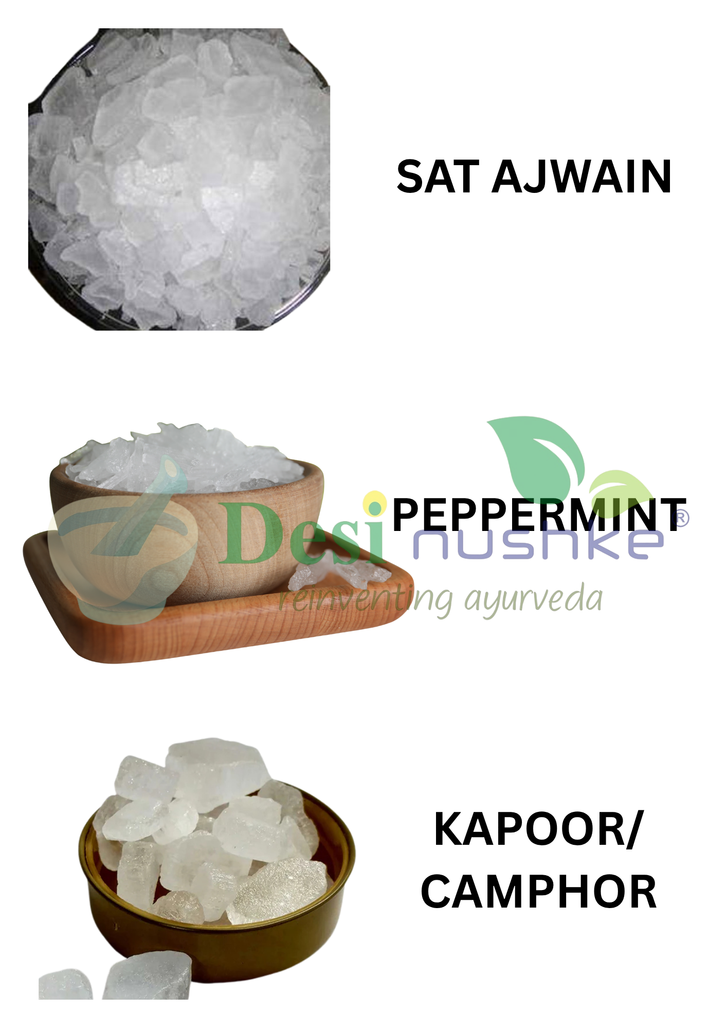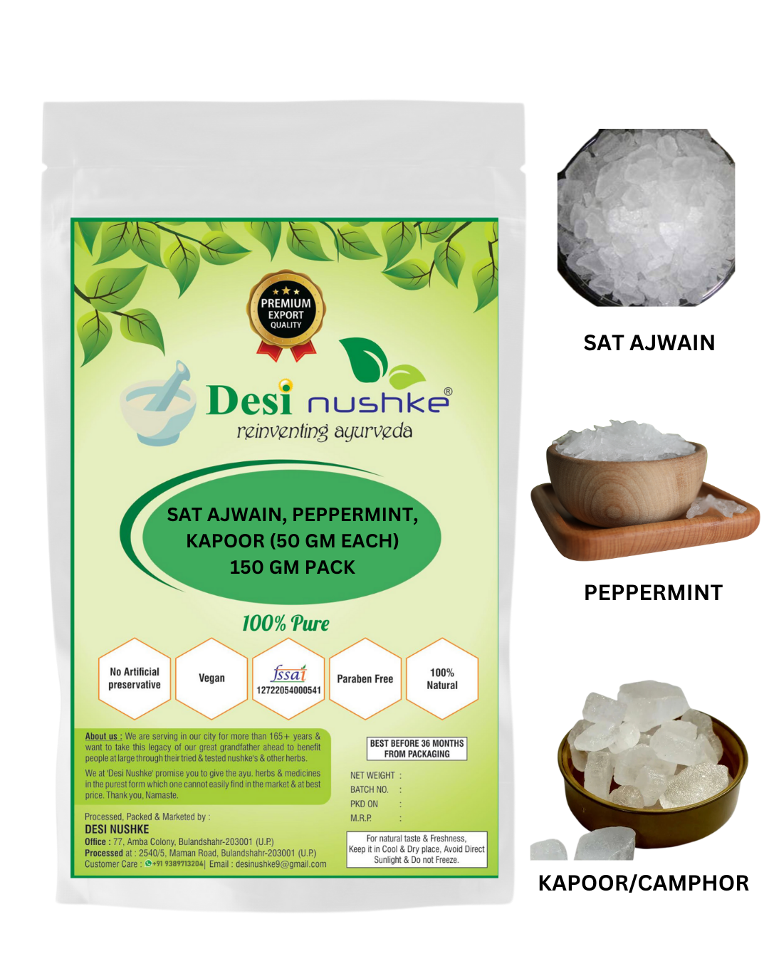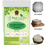 DESI NUSHKE Sat Ajwain, Peppermint & Kapoor Crystal (50 GM Each) Combo | 150 GM | Thymol (Ajwain ki Phool), Menthol & Camphor Crystal | Total Weight 150gm | 100% Pure & Natural | Aromatherapeutic I Plant-Derived | 5.29 Oz